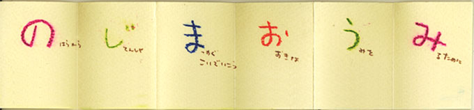<<それぞれの文字でことばをつくってみよう>> のじまくんは、こんなふうにかきました。 のはらから じてんしゃ まっすぐこいでいこう おおきな うみを みるために